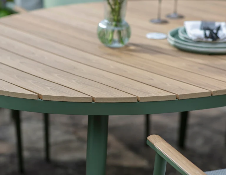 The Wisley range is part of an exclusive collection by Bramblecrest and the RHS. Featuring criss-cross seatback detailing and a pared-back profile this six-seat oval dining set in Sage blends beautifully with its natural surroundings. Style Notes: Designed in a lovely shade of sage, the RHS Wisley collection blends beautifully with natural settings. Featuring criss-cross seat back detailing offset by a pared-back profile, and finished with complementary mist-coloured fabric, it's the ideal choice for those wishing for a simpler style.